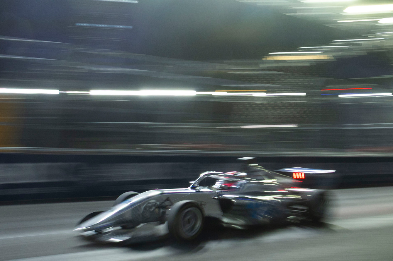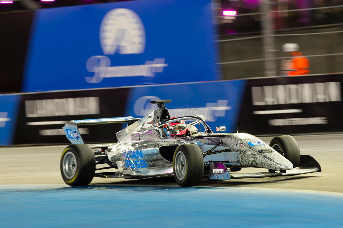 Rain-soaked streets set the stage for a chaotic Race 1 in Las Vegas. Even before the lights went out, the wet conditions saw all drivers change to wet tires. Polesitter Nina Gademan required a front-wing change, while Canadian Nicole Havrda – already starting last due to a qualifying problem – opted to begin from the pit lane.